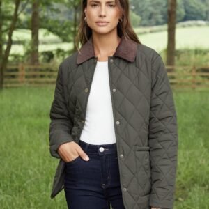 In a slim fit and with a contrast corduroy collar, this coat has diamond quilting padding and shaping princess seams for elevated style. Fully lined with a cotton gingham lining with gunmetal snap fastening and keep your hands out of the cold with two front patch pockets.